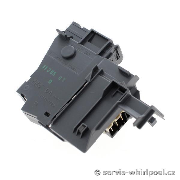 Originální zámek (blokování) víka pro vrchem plněné pračky značek Whirlpool, Indesit a Bauknecht. Tento elektrický bezpečnostní prvek zajišťuje pevné uzamčení horního víka během pracího cyklu, čímž chrání před jeho otevřením a únikem vody během provozu.
