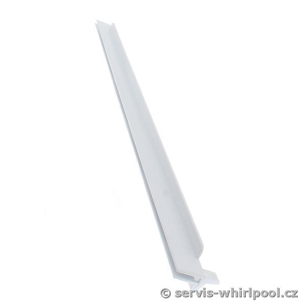 Krycí lišta (zadní) pro skleněné police chladniček Whirlpool a Hotpoint. Díl je vhodný do chladniček B TNF 5322 OX, B TNF 5323 OX, B TNF 5323 OX 3, B TNF 5323 W, T TNF 8111 H W, WB70E 973 X a dalších modelů.