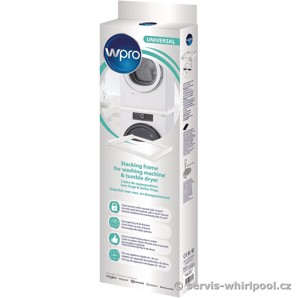 Univerzální mezikus mezi pračku a sušičku značky Wpro CDS 102. Montážní souprava slouží díky zařízení "Safe-in-Lock" k naprosto bezpečnému umístění sušičky nad pračku s předním plněním. Tím zlepšuje využití prostoru v místnosti.